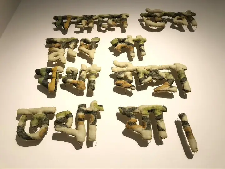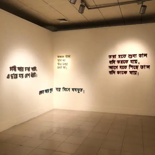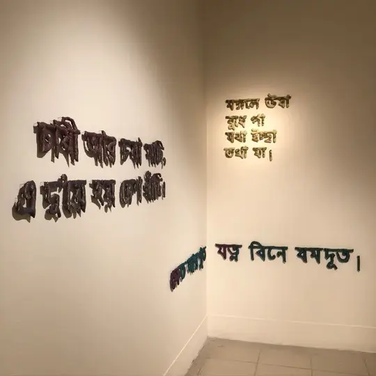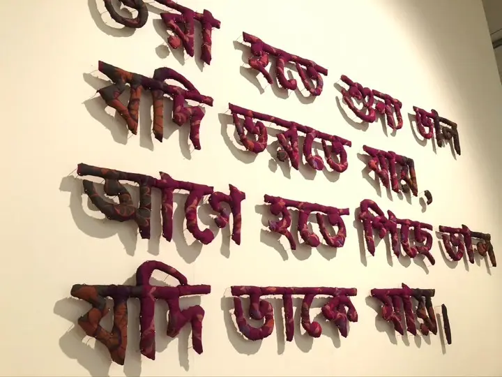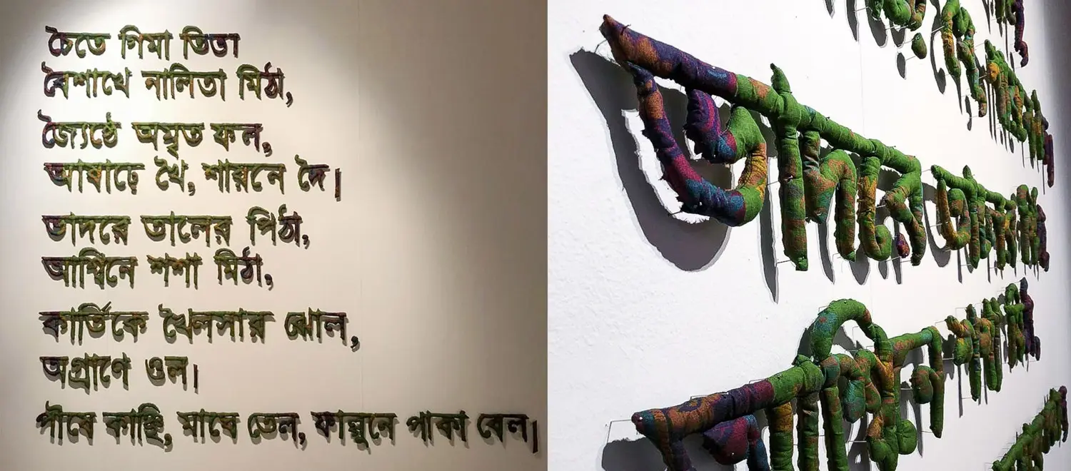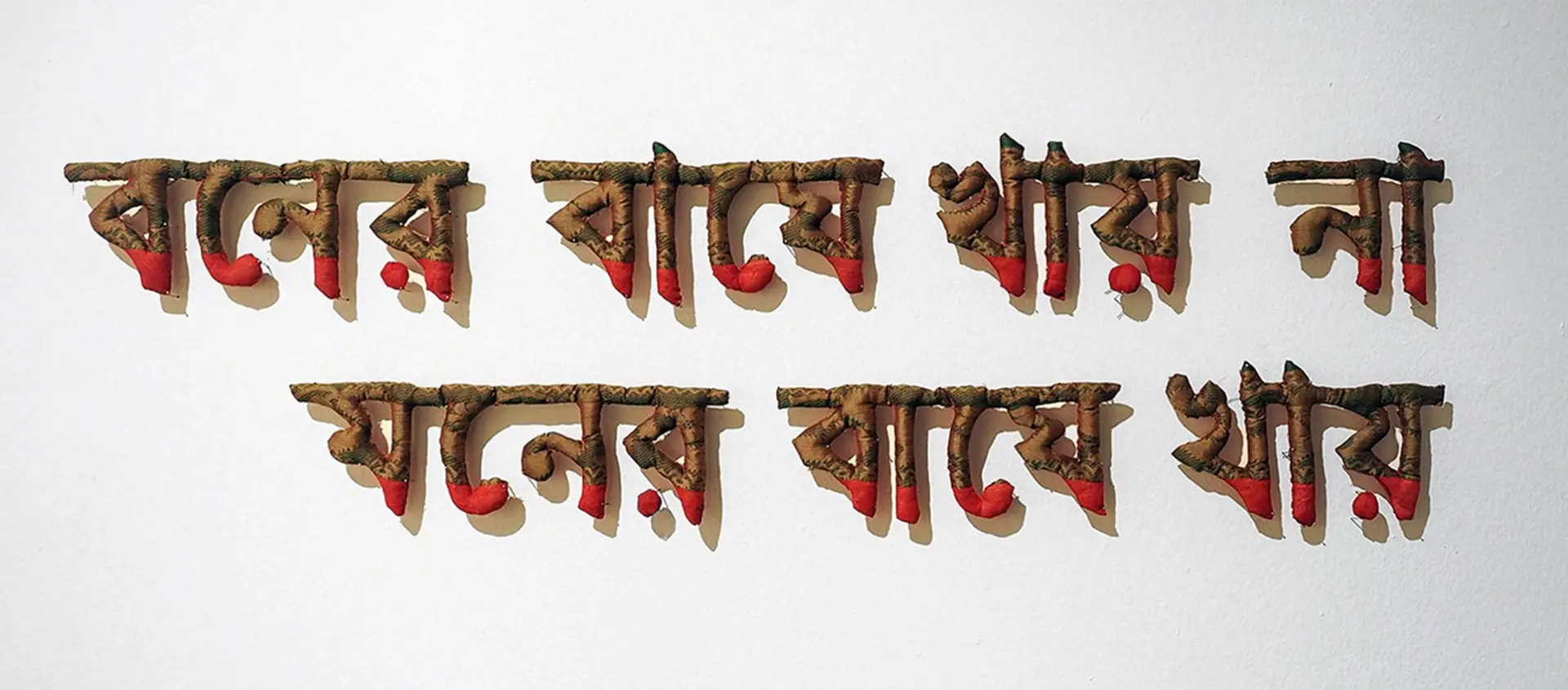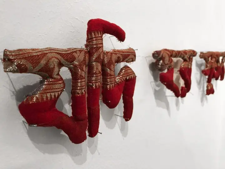 Medium: Hand woven Tangail Sari (Traditional cloths),  cotton, thread and nails.